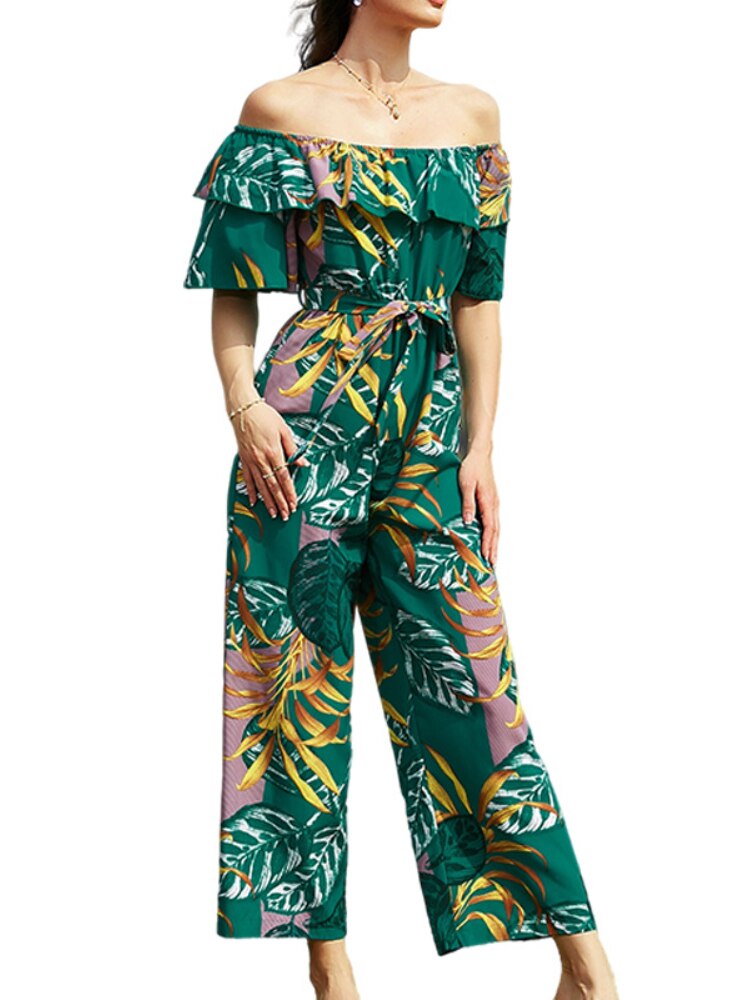 Sexy Women Jumpsuits Off shoulder Ankle length wide leg pants Ruffles short sleeve Casual holiday jump suits for women rompers